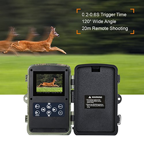 - 0.2-0.6s tiempo de activación : dará disparo cuando la cámara con 98°ángulo de visión y 2.4" LCD Pantalla detecta acción de animales al rango 120°de sensor. El rango es de 0.2-0.6s.