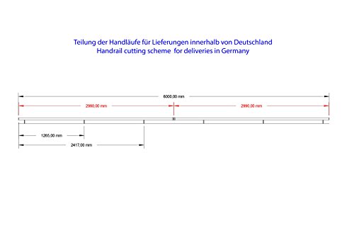 Alemania: a partir de una longitud de 3,10 m, los pasamanos se envían divididos, hasta 3 metros incluidos no se dividen. También ofrecemos pasamanos no divididos de hasta 6 metros de longitud.